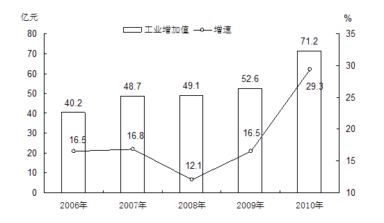 工业:全年全部工业增加值712140万元,比上年增长29.3%,比2005增长1.27倍,年均增长17.9%。规模以上工业增加值535751万元,增长34.5%,其中国有及国有控股企业增长13.5%,集体企业增长20.2%,非公有制企业增长36.5%。分轻重工业看,轻工业增长46.9%,重工业增长30.7%。规模以下工业增加值176389万元,增长14.3%。