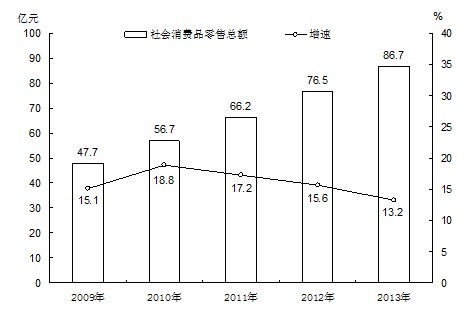 2009-2013年社会消费品零售总额及增长速度