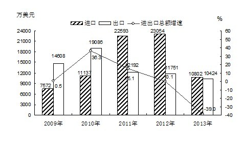 全年外贸进出口总值21226万美元,比上年下降39%。其中,进口总值10802万美元,比上年下降53.2%;出口总值10424万美元,比上年下降11.2%。进出口差额(出口-进口)-378万美元,比上年增加10925万美元。从贸易方式看,一般贸易进出口总值16854万美元,比上年下降41.1%;加工贸易进出口总值2269万美元,比上年下降44.7%;边境小额贸易进出口总值2102万美元,比上年增长16.3%。从企业性质看,私营企业进出口总值18665万美元,比上年下降0.3%;外资企业进出口总值1744万美元,比上年下降36.5%;国有企业进出口总值144万美元,比上年下降98.7%。