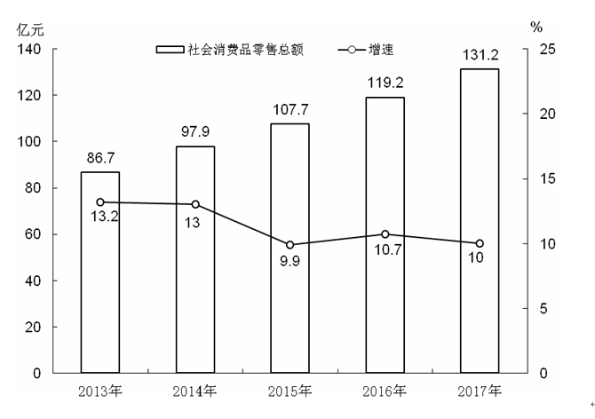 图7 2013-2017年社会消费品零售总额及增长速度