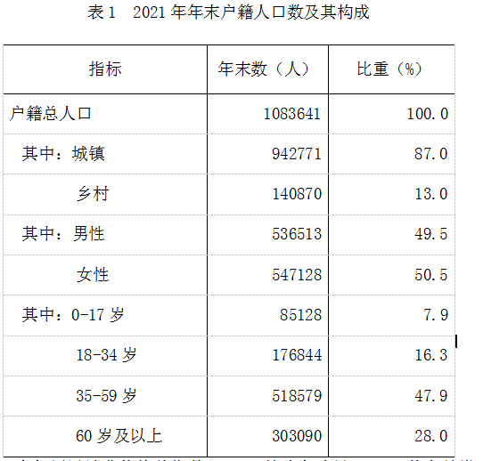 据公安部门统计,年末全市户籍总人口1083641人,比上年减少19309人。其中:城镇人口942771人;乡村人口140870人。户籍人口城镇化率87.0%。男性人口536513人,占总人口的49.5%;女性人口547128人,占总人口的50.5%。全市出生人口2321人,死亡人口8817人。