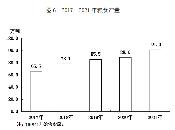 2021年全市粮食播种面积278397.1公顷,同比增长2.2%。其中:稻谷面积60258.7公顷,同比增长4.4%;玉米面积85137.2公顷,同比增长90.9%;大豆面积129744.2公顷,同比下降22.0%。全年粮食总产量101.3万吨,比上年增产12.7万吨,同比增长14.4%。其中,玉米产量47.4万吨,同比增长77.2%;稻谷产量34.5万吨,同比下降0.4%;大豆产量18.7万吨,同比下降29.6%。