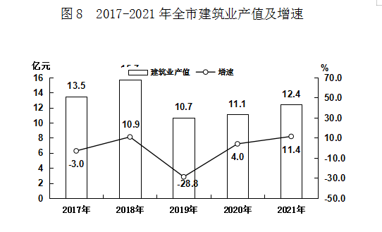 全市具有资质等级的总承包及专业承包建筑企业99个,完成总产值123736万元,比上年增长11.4%。房屋建筑施工面积13.2万平方米,比上年下降52.0%。房屋建筑竣工面积4.8万平方米,比上年下降76.1%,竣工产值65454万元,比上年下降23.5%。