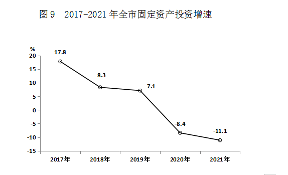 全年固定资产投资比上年下降11.1%。从经济类型看,国有控股投资下降5%;民间投资下降18.8%。从三次产业看,第一产业投资增长27.4%;第二产业投资下降27.4%,其中工业投资下降27.4%;第三产业投资下降8.1%。从隶属关系看,地方投资下降23.6%,中央投资增长262.6%。全年到位资金比上年增长9.9%。