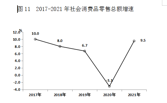 全年社会消费品零售总额比上年增长9.5%。按商品形态分,商品零售额比上年增长8.6%;餐饮收入额比上年增长12.6%。按地域分,城镇消费品零售额比上年增长9.5%;乡村消费品零售额比上年增长9.0%。