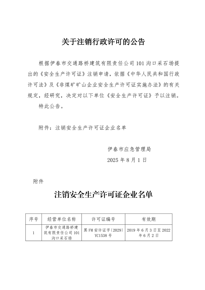 关于注销皇冠手机官网交通路桥建筑有限责任公司101沟口采石场安全生产许可证行政许可的公告