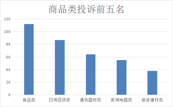 1、商品类投诉:共受理商品类投诉644件,占投诉总量的60.2%。排在前五位的分别是食品类112件,日用百货类87件,通讯器材类64件,家用电器类55件,装修建材类38件,这五大类商品占商品类投诉总量的55.3%。