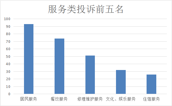 2.服务类投诉:共受理服务类投诉425件,占投诉总量的39.8%。居服务类投诉首位的是居民服务93件,其次是餐饮服务74件,修理维护服务51件,文化、娱乐服务32件,住宿服务26件,这五大类服务占服务类投诉总量的65%。