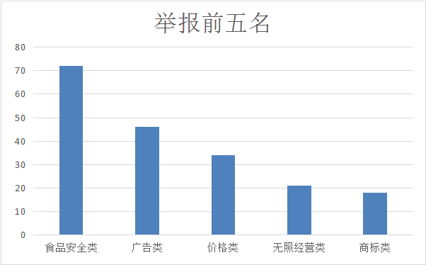 全市12315投诉举报办公室共受理举报345件,与去年同期473件减少128件,下降27.1%。居举报首位的是食品安全类72件,其次是广告类46件,价格类34件,无照经营类21件,商标类18件,这五大类占举报总量的55.4%。
