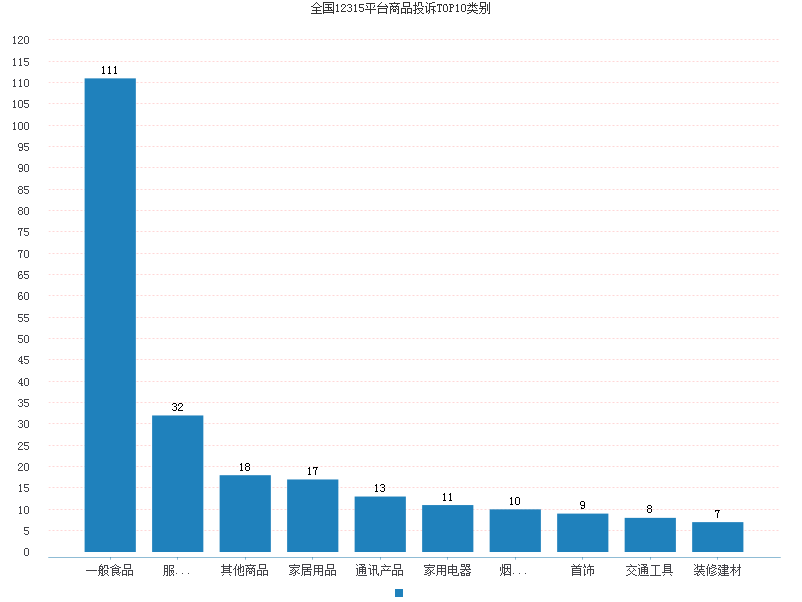 (一)从商品投诉来看,投诉受理量较大的商品主要有:一般食品(111件)、服装鞋帽(32件)、其他商品(18件)、家居用品(17件)、通讯产品(13件)。