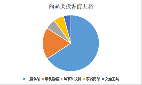 商品类投诉266件,投诉量位居前五位的分别是一般食品(111件)、服装鞋帽(31件)、烟酒和饮料(10件)、家居用品(10件)、交通工具(7件),合计占比63.5%。