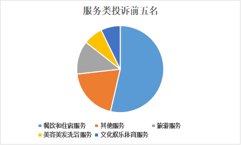 服务类投诉受理133件,投诉量位居前五位的分别是餐饮和住宿服务(52件)、其他服务(19件)、旅游服务(12件)、美容美发洗浴服务(7件)、文化娱乐体育服务(7件),合计占比72.9%。