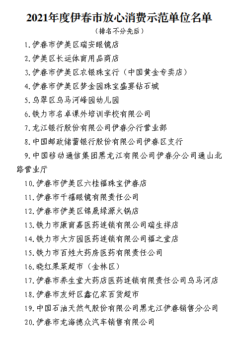 为深入开展放心消费创建工作,进一步提升消费环境的安全度,提高经营者诚信度和消费者满意度,助力我市文明城市创建,2021年全市各有关部门紧紧围绕放心消费创建工作目标,组织开展先进、示范单位创建活动。经所在行业主管部门推荐、市放心消费创建工作领导小组相关成员单位审核把关,现根据创建活动组织程序,对2021年度全市放心消费示范单位(共20家)予以公示,请社会各界予以监督。