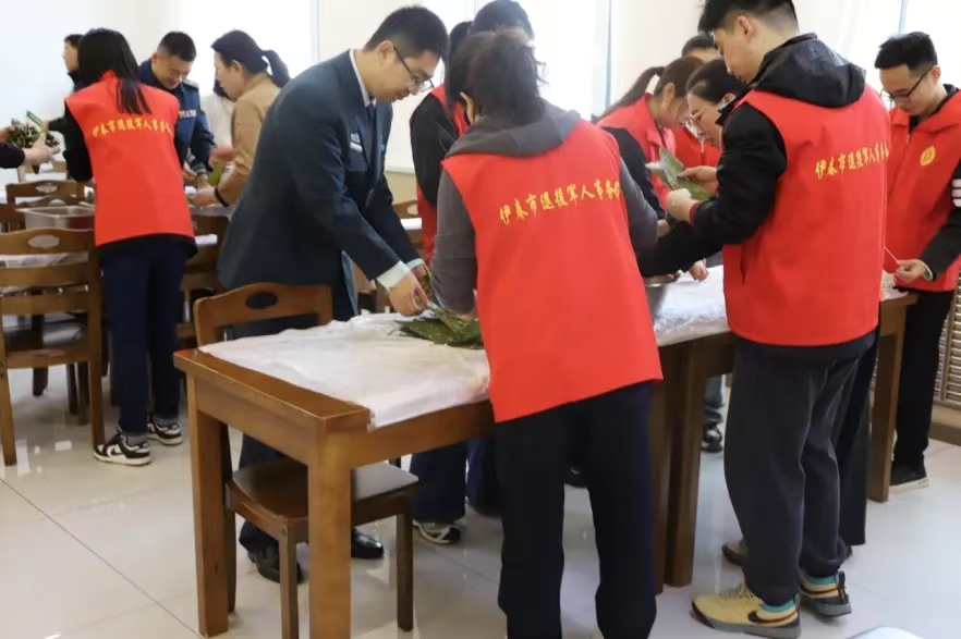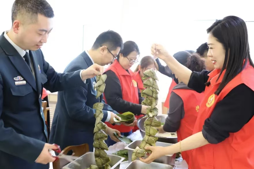 活动现场,包粽环节热闹非凡。“橄榄绿”退役军人志愿者化身技艺导师,一边示范“三角粽”“枕头粽”的折叠技巧,一边讲解端午习俗。志愿者和官兵们分组协作,将粽叶卷成漏斗状,填入馅料后轻轻压实,再用棉线细密缠绕。欢声笑语中,数百个饱含心意的粽子迅速成形。在趣味比拼环节,军民组队展开包粽竞速赛,“最快手速奖”“创意造型奖”的角逐将现场气氛推向高潮。当一锅锅热气腾腾的粽子出锅,军民一起分享劳动成果,粽香与情谊交织,勾勒出温馨和谐的双拥画卷。