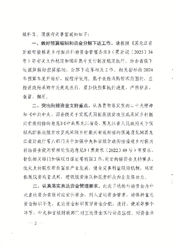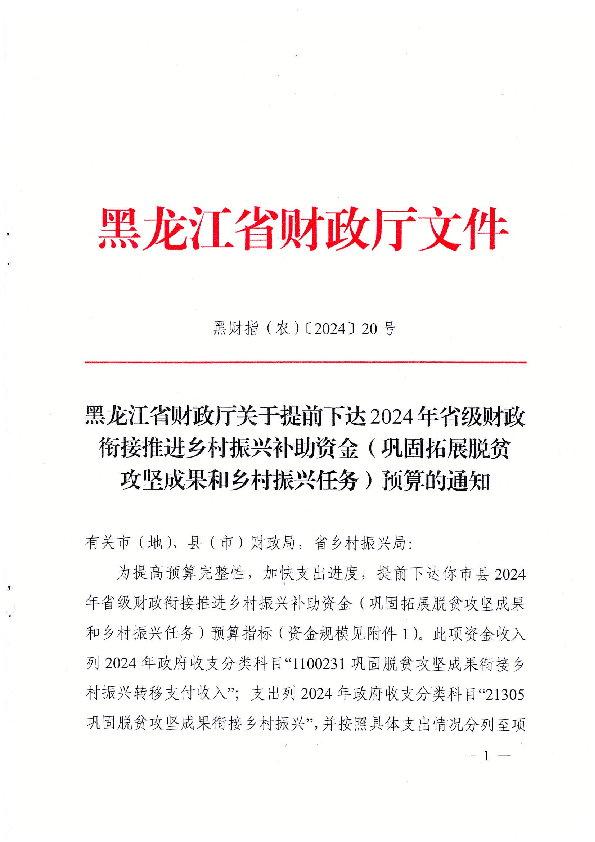 黑龙江省财政厅关于提前下达2024年省级财政衔接推进乡村振兴补助资金(巩固拓展脱贫攻坚成果和乡村振兴任务)预算的通知 (黑财指(农)〔2024〕20号)